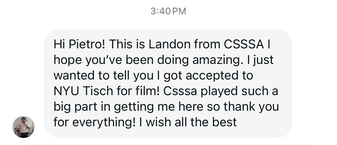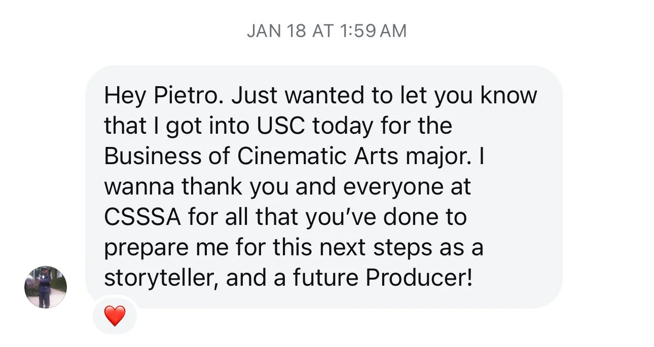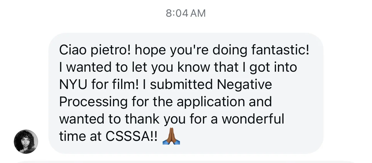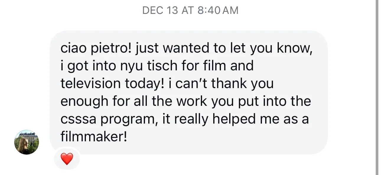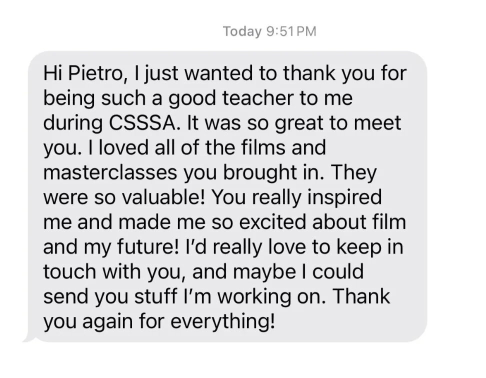He is currently teaching Advanced Producing and Directing at SFFS, working alongside several Oscar-nominated artists. Pietro is the Film Chair for the California State Summer School for the Arts - CSSSA