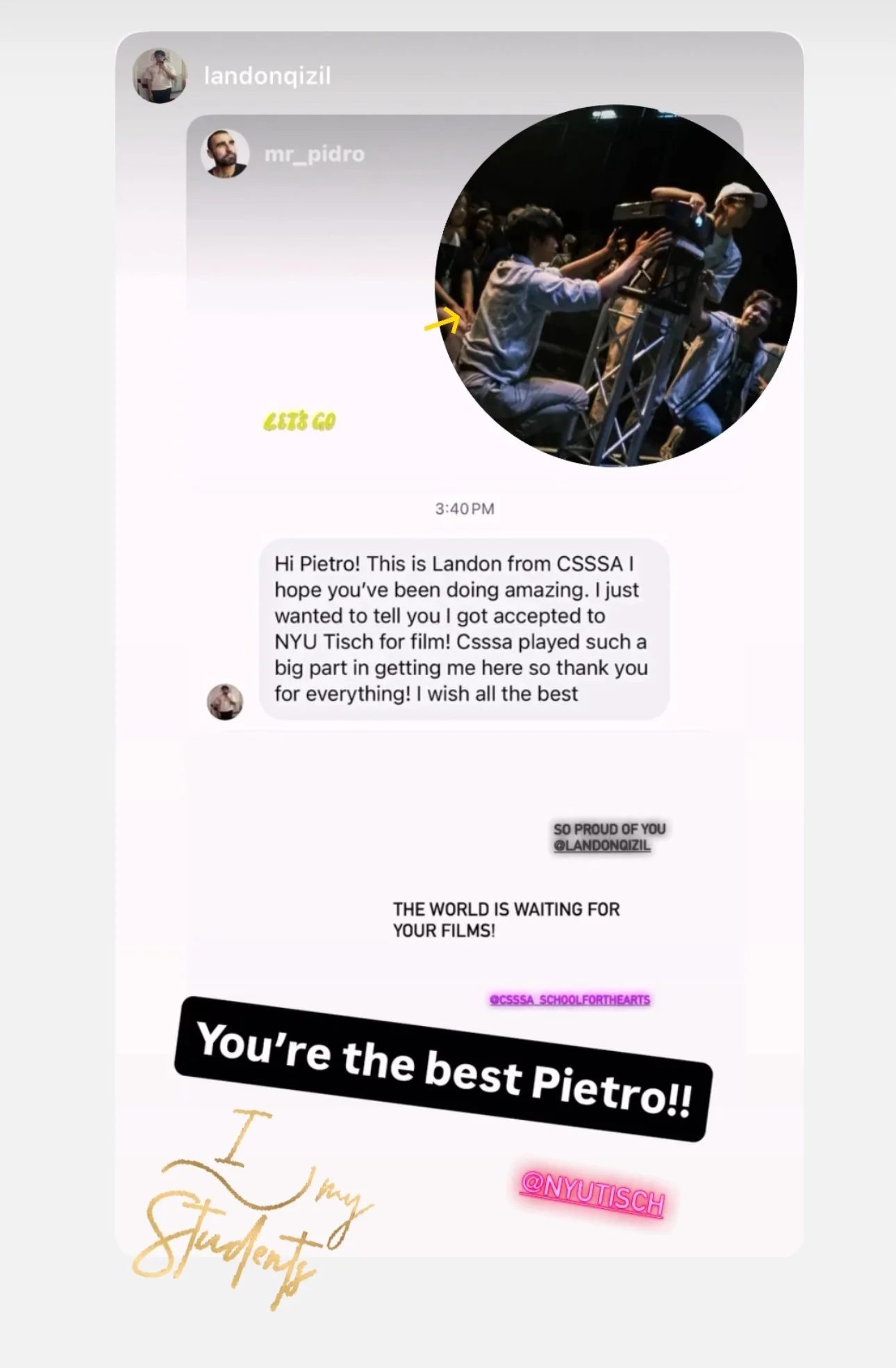 In 2023, Pietro became the Film Chair at California’s most prestigious youth summer program for the arts, hosted at CalArts in Los Angeles. Overseeing curriculum development, faculty recruitment, and film department budget, he actively collaborates with esteemed institutions such as the American Cinematheque and The Golden Globe Foundation to foster the next generation of filmmakers.
